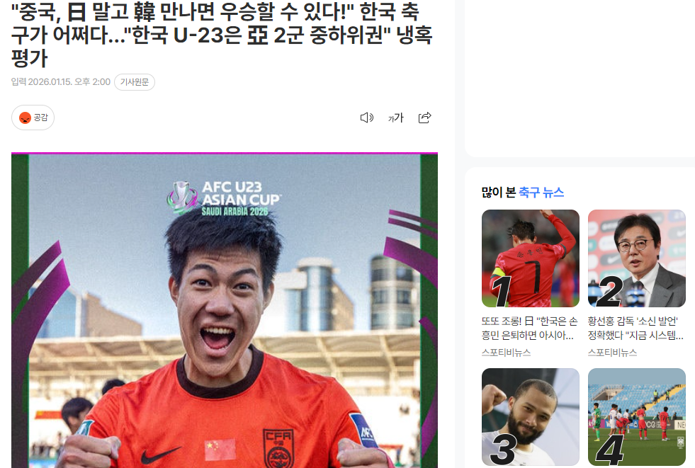 此外,Naver上还有一篇类似的文章(上图),标题大意是:“中国队只要不碰日本队,遇到韩国队就能夺冠!”韩国足球怎么会沦落到这种地步……“韩国U-23在亚洲只能算二流偏下水平”——冷酷评价。