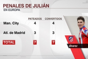 100%!阿尔瓦雷斯登陆欧洲以来7次罚点均命中 xiaoqiao 2026年01月05日 04:14 38 0 体育资讯4月6日讯 西甲第30轮比赛,阿尔瓦雷斯点射破门,目前马竞1-1塞维利亚。 据ESPN统计,阿尔瓦雷斯登陆欧洲联赛以来7次主罚点球,全部命中,其中包括曼城4球、马竞3球。
